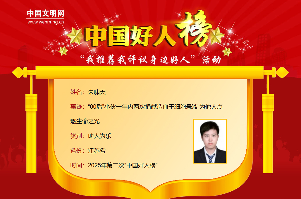 朱嘯天,男,2000年5月生,中共黨員,江蘇省金湖縣人民法院法官助理。2024年4月,朱嘯天為一名陌生的血液病患者捐獻(xiàn)造血干細(xì)胞懸液227毫升。2025年3月,他再次為該患者捐獻(xiàn)造血干細(xì)胞懸液226毫升,又一次為患者帶去了生的希望。