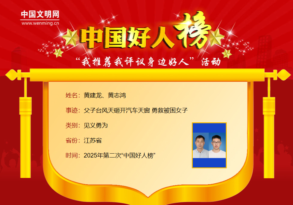 黃建龍,男,1976年8月生;黃志鴻,男,2001年8月生,二人均為江蘇省江陰市徐霞客鎮(zhèn)紅星村村民。2024年9月16日,黃建龍、黃志鴻父子不顧自身安危,成功砸開一輛落水轎車的天窗,將一位呼吸暫停的女子成功救出。在過路行人的合力救助下,黃建龍、黃志鴻父子及時把該女子送往醫(yī)院,為搶救贏得了寶貴時間。