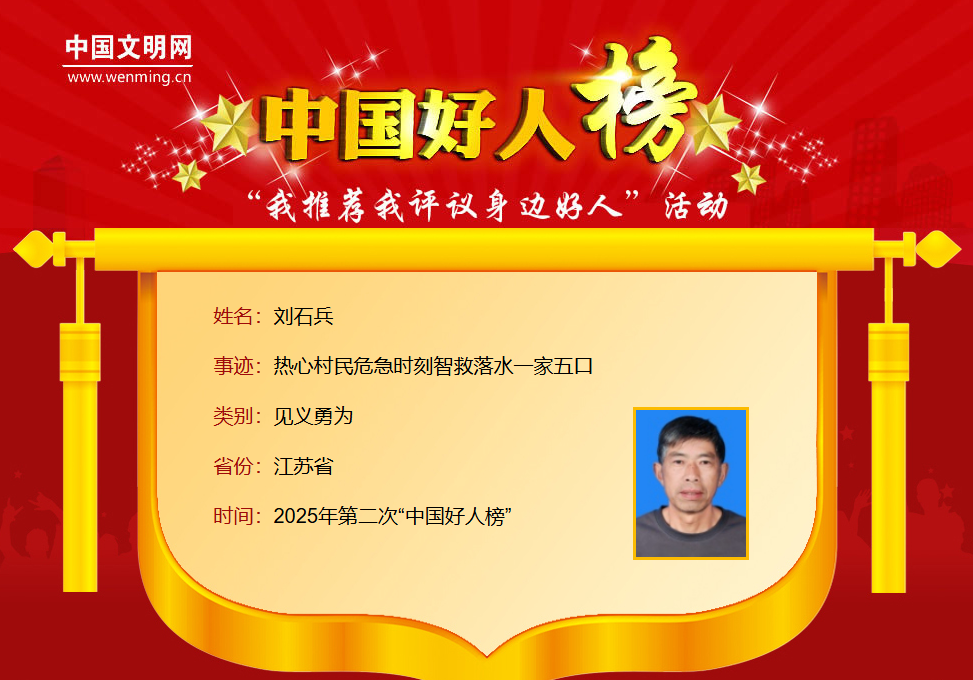 劉石兵,男,1968年9月生,江蘇省泰州醫(yī)藥高新區(qū)(高港區(qū))胡莊鎮(zhèn)劉蕩村村民。2025年2月11日,56歲的劉石兵憑借冷靜的判斷與過人的勇氣,從即將沉沒的轎車中救出一家5口,用實際行動詮釋見義勇為的精神內(nèi)涵,展現(xiàn)了平凡人的英雄本色。劉石兵曾榮登“江蘇省見義勇為勇士榜”等榮譽。