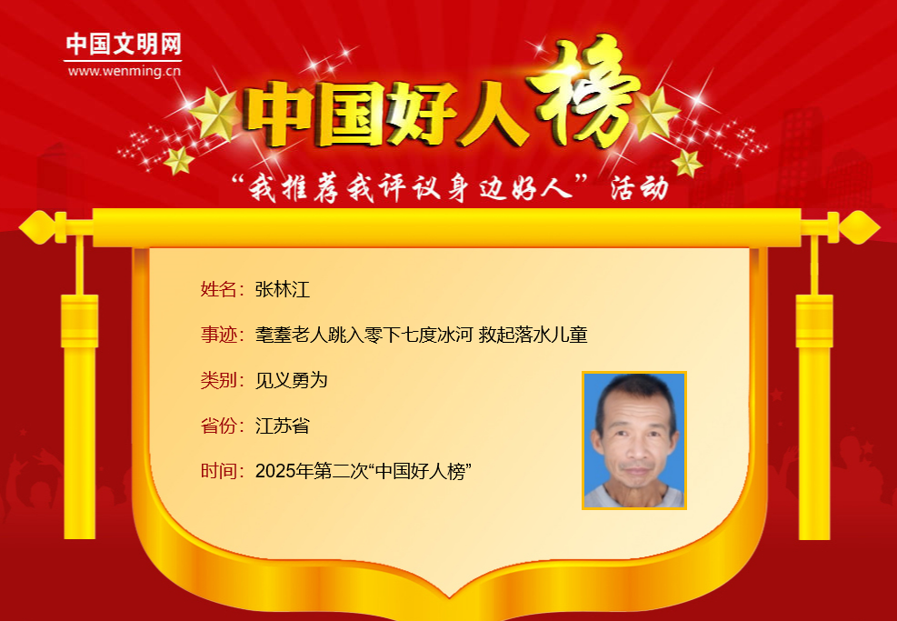 張林江,男,1941年11月生,江蘇省南通市海門區(qū)四甲鎮(zhèn)金躍村村民。2025年2月9日,氣溫降到了-7℃,一名孩子在冰面上玩耍時不慎掉入冰河。張林江看見后毫不猶豫跳入河中,以耄耋之軀救起9歲落水兒童。
