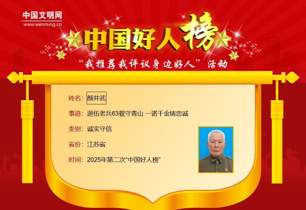 顏井武,男,1933年12月生,中共黨員,江蘇省連云港市云臺山景區(qū)南云臺林場退休職工。從1957年立下綠化荒山的誓言開始,顏井武就把家搬進(jìn)了深山,將自己與大山連接在了一起。年輕時,他帶著工人們植樹造林、改造荒山,退休后依然執(zhí)著無償守護(hù)山林。63載的堅守,從青絲到白發(fā),他用執(zhí)著信念譜寫出一曲守信踐諾的感人詩篇。顏井武曾榮獲全國最美護(hù)林員、“江蘇好人”等榮譽。
