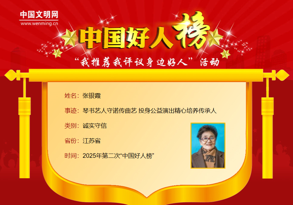 張銀霞,女,1948年6月生,江蘇省蘇北琴書省級代表性傳承人。張銀霞答應(yīng)父親要求并鄭重許下傳承蘇北琴書的諾言,這一諾,便是六十余年的堅守。她始終踐行“藝術(shù)服務(wù)于民”的初心,先后參與惠民演出2000多場,惠及觀眾30萬多人次。從青蔥歲月到白發(fā)染霜,張銀霞始終堅守著對蘇北琴書的傳承使命。張銀霞曾榮獲“中國曲藝牡丹獎”等榮譽。