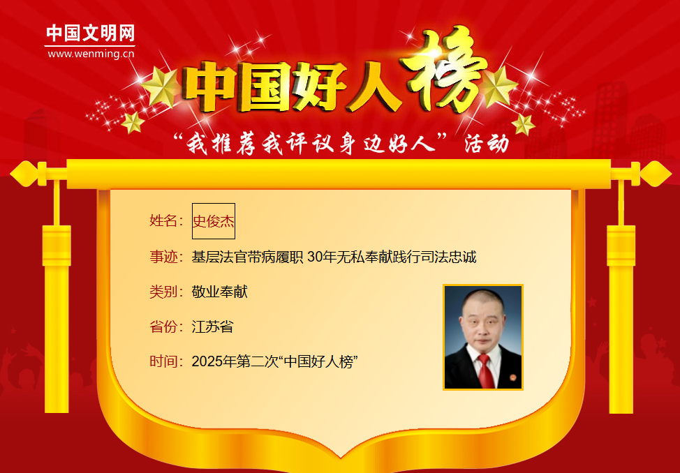 史俊杰,男,1970年生,中共黨員,生前系江蘇省南京市江寧區(qū)人民法院房地產(chǎn)庭法官。史俊杰身患強直性脊柱炎20多年,在以頑強毅力與病魔斗爭的同時,始終堅守在一線審判崗位,辦結(jié)多起全國“首例”案件,用法槌堅定維護(hù)公平正義。他心系群眾,始終把百姓疾苦放在心頭,面對涉民生案件,想方設(shè)法確保群眾權(quán)益落到實處,贏得了當(dāng)?shù)厝罕姷目隙ê唾澰S。