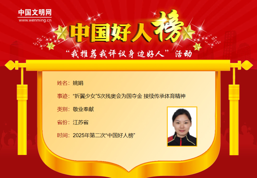 姚娟,女,1984年7月生,江蘇省無錫市殘疾人綜合服務(wù)中心科員,江蘇省殘疾人田徑隊教練員兼運動員。姚娟共獲得五次殘奧會冠軍,保持著投擲類運動(鉛球、鐵餅、標(biāo)槍)的多項世界紀(jì)錄,且是世界罕有的殘奧會投擲類運動“大滿貫”運動員。姚娟曾榮獲全國五一勞動獎?wù)?、全國三八紅旗手、全國優(yōu)秀運動員等榮譽。