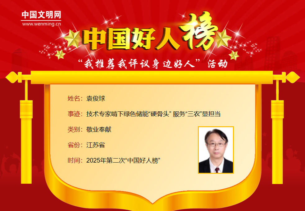 袁俊球,男,1971年5月生,中共黨員,江蘇省常州某電力有限公司三級專家。袁俊球扎根能源領(lǐng)域30余載,取得授權(quán)專利30余項,攻克蒸汽儲能、糧食烘干、智慧漁業(yè)等多項技術(shù)難題,累計為企業(yè)降本超1.5億元,惠及金壇區(qū)300余家企業(yè)和鄉(xiāng)村產(chǎn)業(yè)項目。他深知農(nóng)民生活艱辛,主動利用休息時間跑遍田間地頭為農(nóng)民解決生產(chǎn)技術(shù)難題。袁俊球曾榮獲全國勞動模范、全國五一勞動獎?wù)碌葮s譽。