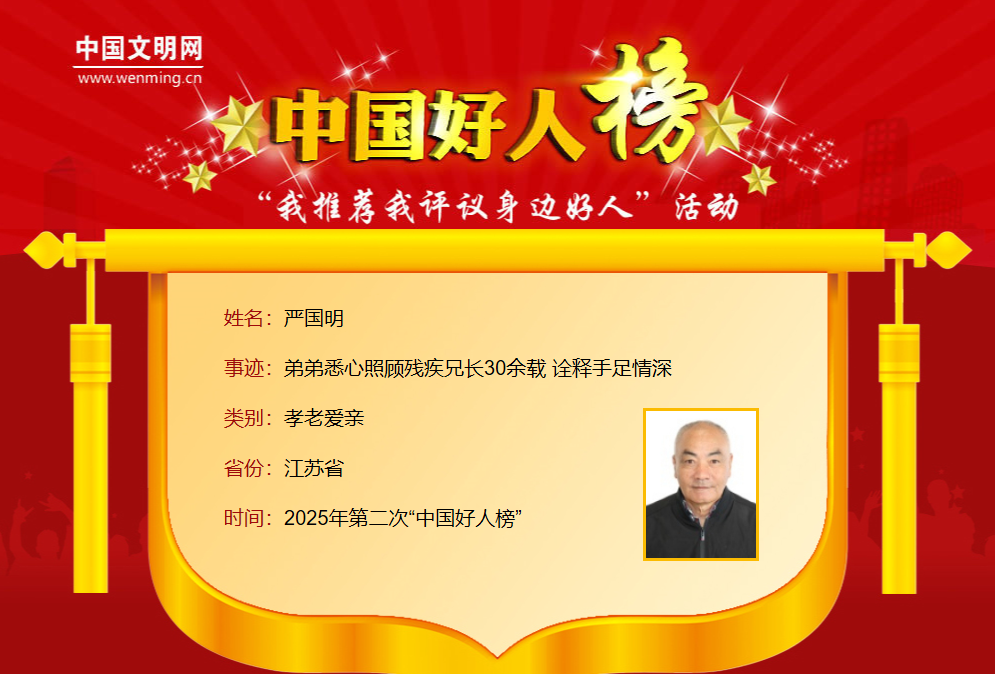 嚴(yán)國明,男,1956年7月生,江蘇省太倉市浮橋鎮(zhèn)新邵村村民。1988年嚴(yán)國明承擔(dān)起照顧兄長的重任,他和妻子一邊打工養(yǎng)家,一邊悉心照料哥哥。30余年的光陰里,他未曾踏足遠(yuǎn)方,卻用雙腳丈量出親情的厚度、詮釋了手足情深。