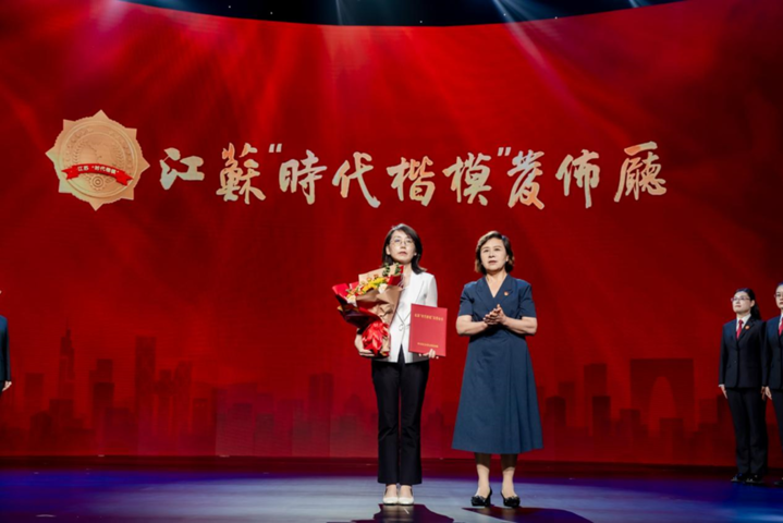 儀征市人民法院青年法官代表集體宣讀致敬辭。江蘇“時(shí)代楷?!?,黨的十八大、黨的十九大、黨的二十大代表,揚(yáng)州市廣陵區(qū)曲江街道文昌花園社區(qū)黨委書(shū)記鄭翔為邊曉斌家屬頒發(fā)榮譽(yù)證書(shū)。
