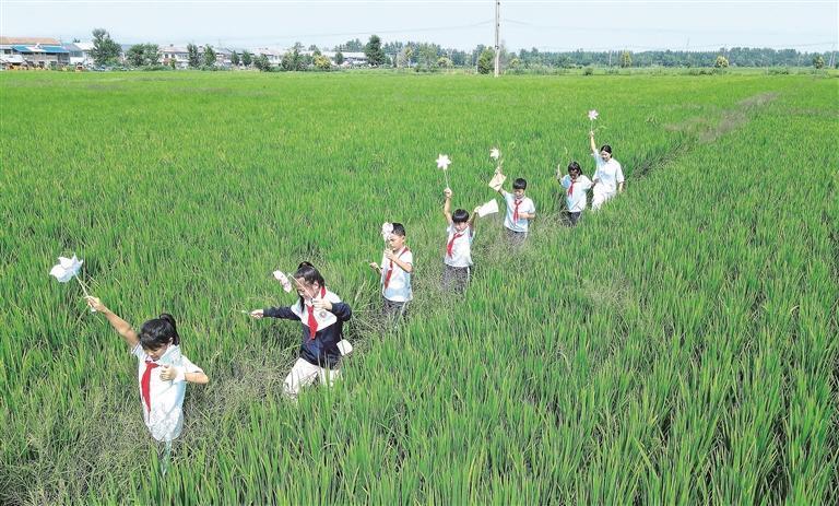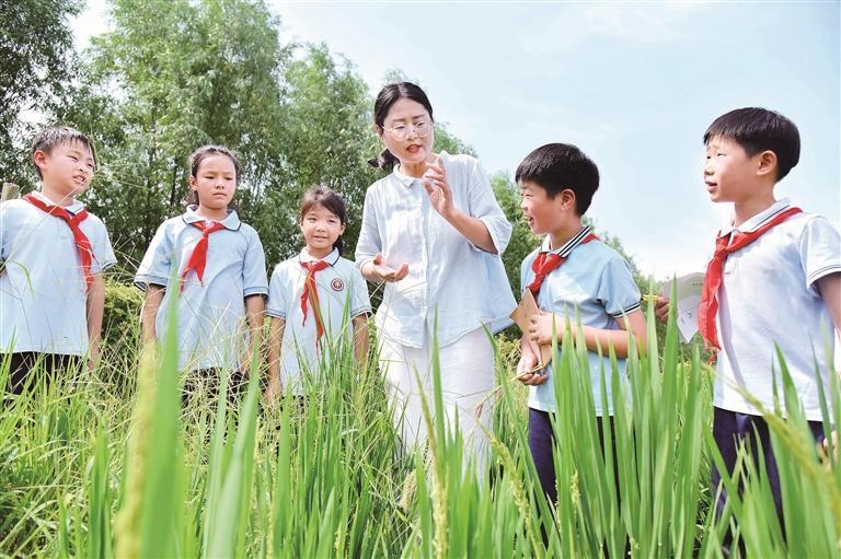 老師帶著孩子們走進(jìn)稻田,親近自然,感受萬物。